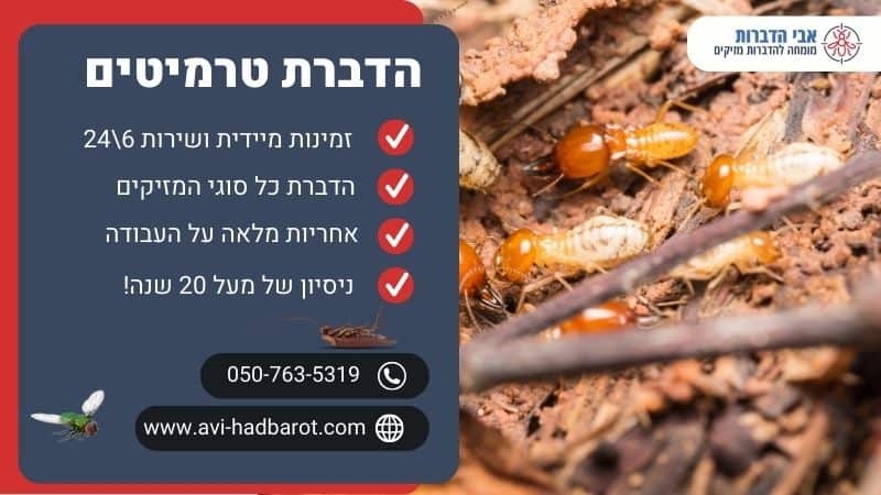 את ההדברה מבצעת חברת אבי הדברות שאחראי על הדברת מזיקים ומכרסמים ב 20 שנים האחרונות. אנחנו נותנים התחייבות חוזית בכל עבודה ומשתמשים בכלים המתקדמים ביותר להדברות מזיקים ומכרסמים מכל הסוגים. באופן כללי את הדברת הטרמיטים בפרט ואת שאר ההדברות צריכות להתבצע אך ורק על ידי אנשי מקצוע ולא באופן עצמאי. מדבירים מנוסים משתמשים בכלים מתקדמים ובטכניקות הדברה מקצועיות והם הוסמכו לעשות עבודה זו.