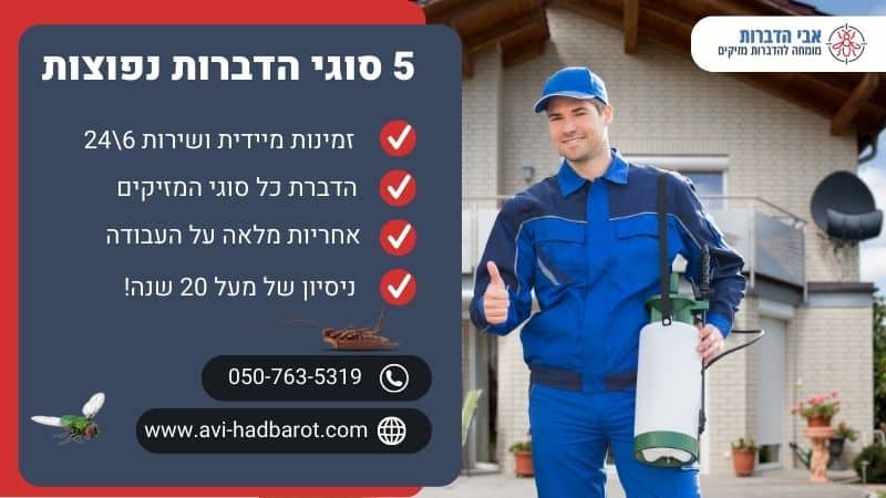 כמו בכל תחום אחר, ישנם כמה סוגים של הדברות שהן הנפוצות ביותר בתחום. אבל, כאדם הממוצע אין לנו ידע בהדברות הספציפיות או בשיטת העבודה שלהן. כשנזמין מדביר, כדאי שנדע כמובן כיצד הוא עובד ונבין את סוג ההדברה עליה הוא המליץ ובמה היא כרוכה. להלן 5 סוגי ההדברות הנפוצות ביותר, ומה משמעותן.